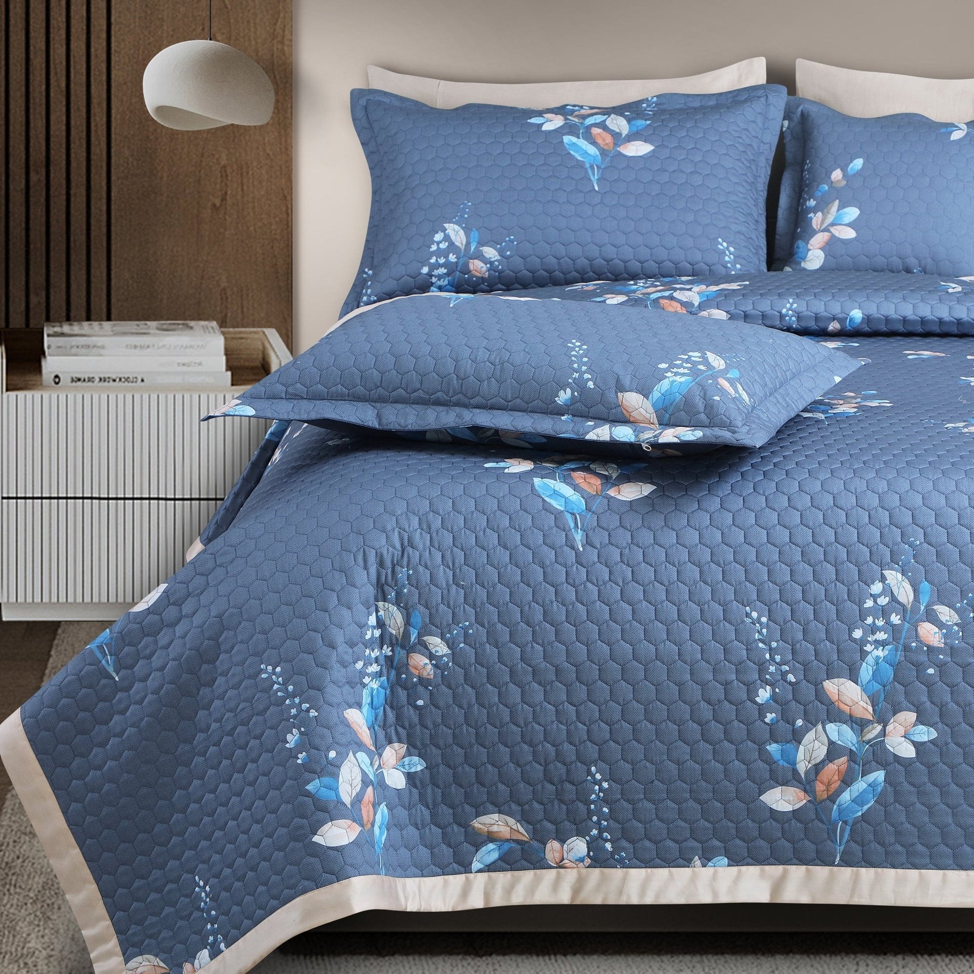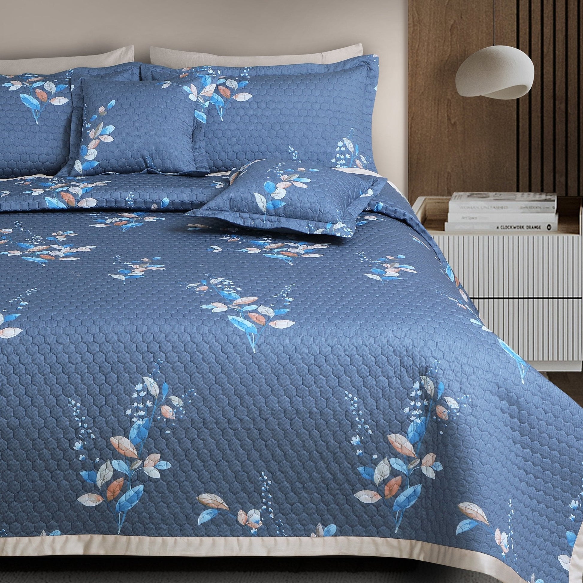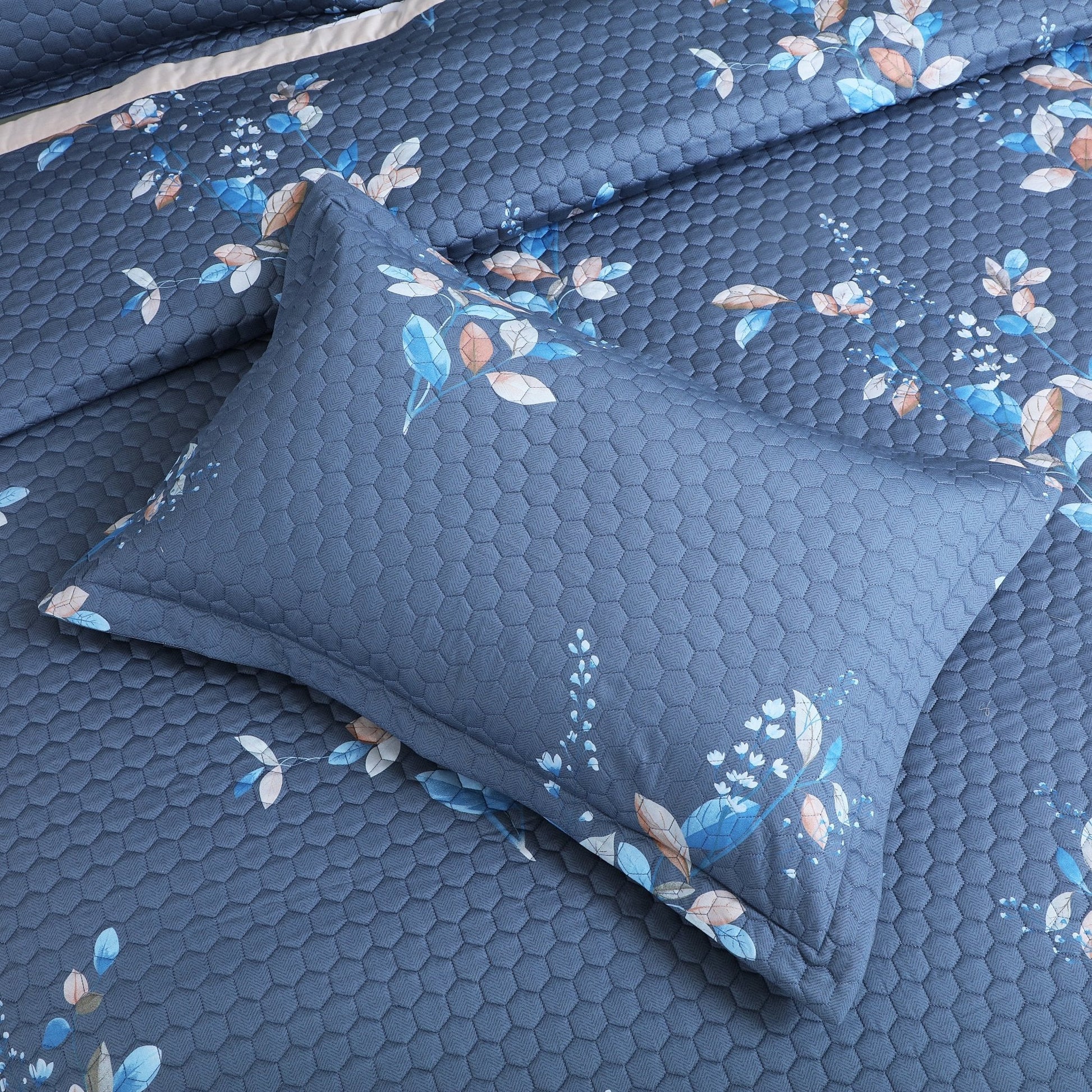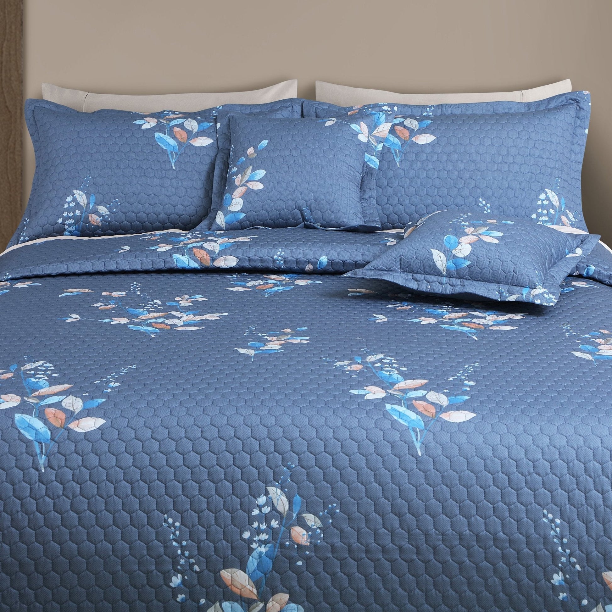 Botanical Serenity Blue Quilted Bedcover Set – 5-Piece King Size (100% Cotton)
